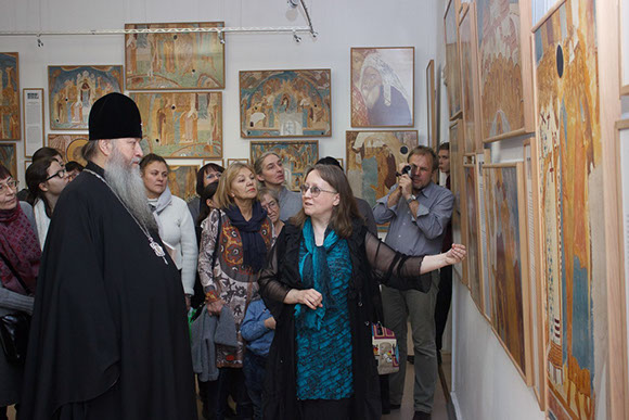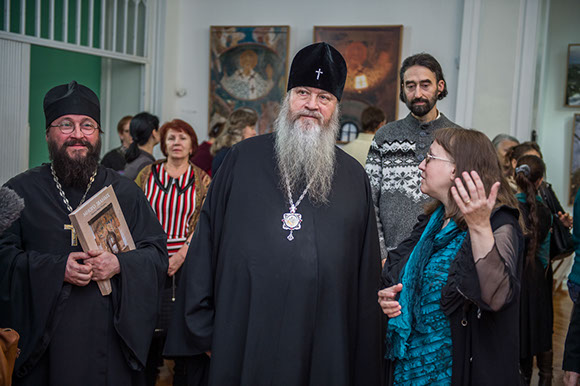 Митрополит Тихон Новосибирский и Бердский, директор НГХМ С.М. Дубровин и президент Фонда "Фрески Руси" Е.В.Данилова на открытии выставки 13 ноября 2015 г.